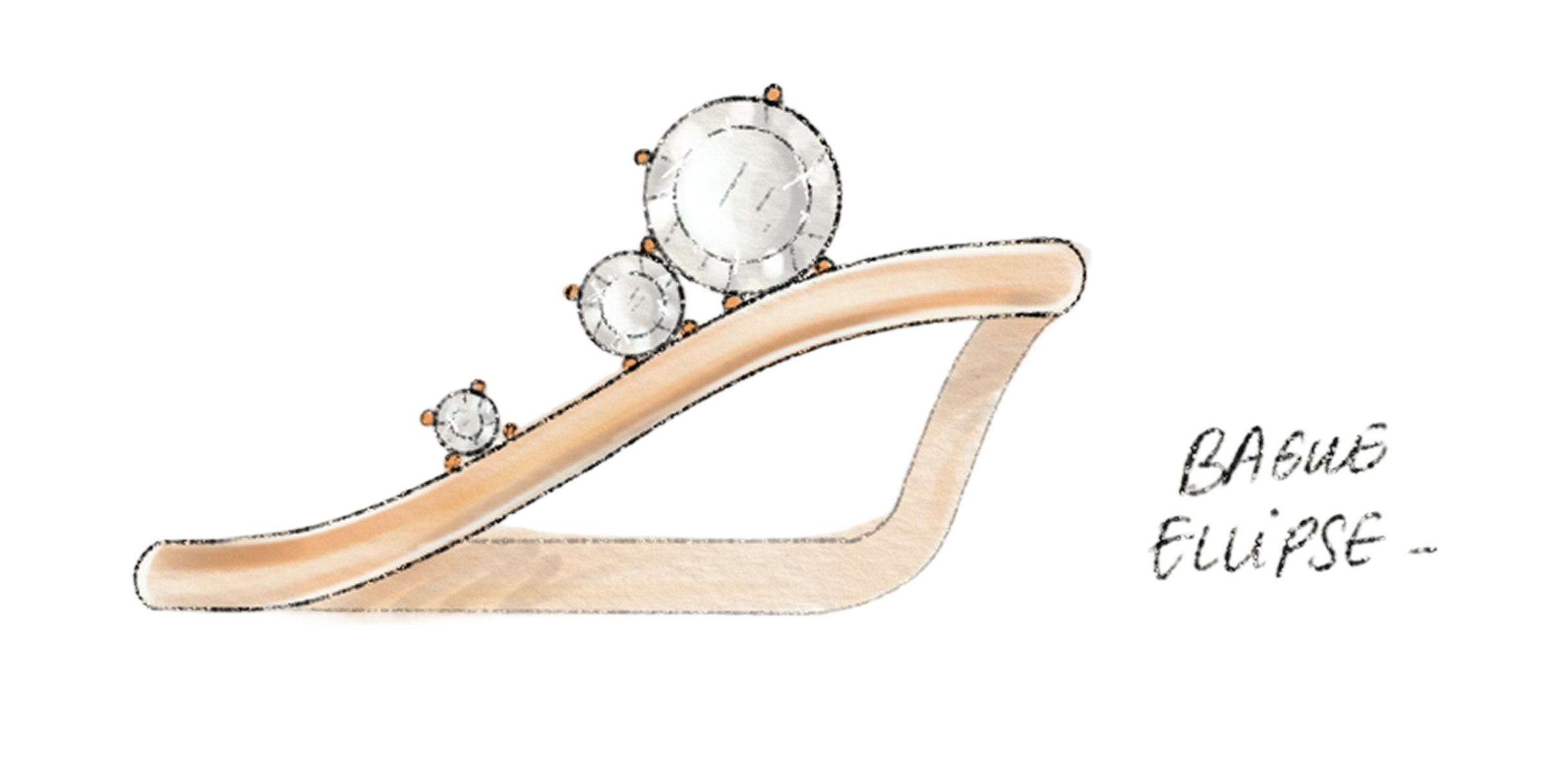 La pierre centrale, plus généreuse, capte la lumière et la redistribue le long de la courbe, accentuant la fluidité du design.