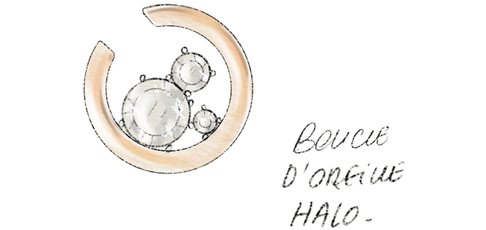 Cette composition asymétrique apporte à Halo une modernité assumée. Les pierres, comme suspendues, captent la lumière et la restituent différemment à chaque mouvement. La boucle se pose naturellement contre l’oreille ; sa courbe, étudiée avec précision, assure confort et légèreté du matin au soir.